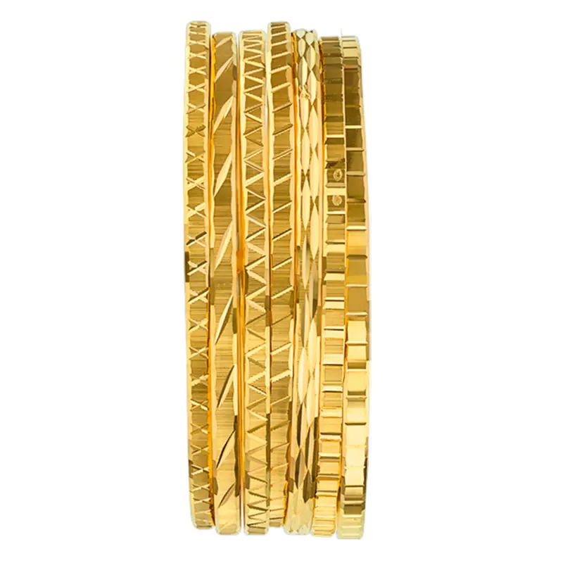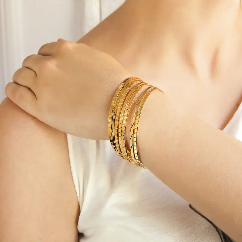 Sublime bracelet jonc en or jaune 750/1000 (18K). Ce bijou est orné de sept bracelets facettés. Ces bracelets jonc et rigides orneront vos poignets en toutes circonstances. Il se mariera aussi bien avec vos tenues chic et élégantes de soirée qu’avec vos vêtements plus classiques et décontractés.