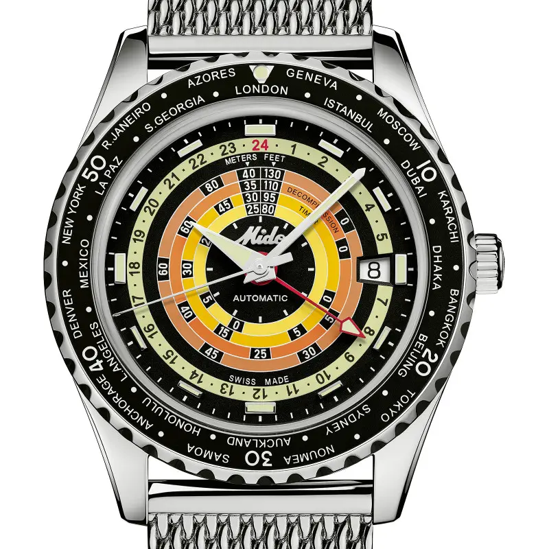 Mido confectionne des montres fonctionnelles et robustes à remontage automatique. Cette marque propose des collections entièrement dédiées aux modèles de plongée munis de boîtiers monocoques et d’un système Aquadura. Elle ne cessera jamais de se surpasser pour atteindre la perfection en vous proposant des prototypes qui assurent une excellente étanchéité grâce au joint de couronne en liège. Dans la collection Ocean Star, se trouve cette Captain Decompression de référence M0268291705100. Elle se pare d’un boîtier de forme ronde fabriqué en acier inoxydable. Sa brillance est accentuée grâce à sa finition polie qui confère à cette horloge un éclat bien défini. Ce dernier arbore un poids de 220 grammes avec un diamètre de 40,50 millimètres et une épaisseur de 13,40 millimètres. Vous noterez que ces dimensions conviendront parfaitement aux poignets masculins. Une lunette cannelée tournante et bidirectionnelle surplombe cette montre. Munie d’un marqueur luminescent, elle a pour particularité d’être marquée par le nom des 24 villes représentant les différents fuseaux horaires. Son cadran est recouvert par un verre saphir bombé très résistant qui le protégera des chocs extérieurs et des rayures du quotidien. À 3 heures, vous remarquerez la présence d’une couronne vissée sur laquelle est gravé le nom de la marque. Elle vous offrira la possibilité de régler les multiples fonctions de ce garde-temps. Son étanchéité de 20 ATM est assurée par le fond de boîte vissé sur lequel sont inscrites quelques caractéristiques.