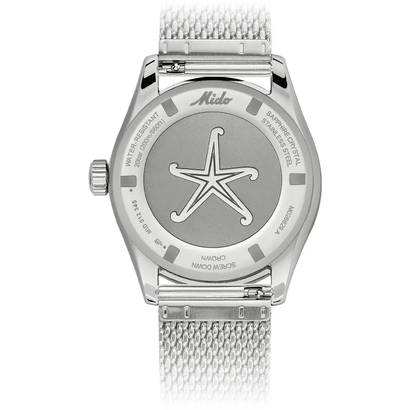 C’est un mouvement automatique Mido Calibre 80 qui vibre au cœur de ce boîtier. De manufacture suisse et propre à la marque, il donnera vie aux aiguilles de cette montre tout en vous offrant précision et fiabilité. De base ETA C07.661, il permet une réserve de marche allant jusqu’à 80 heures et son spiral Nivachron assurera une résistance aux champs magnétiques.