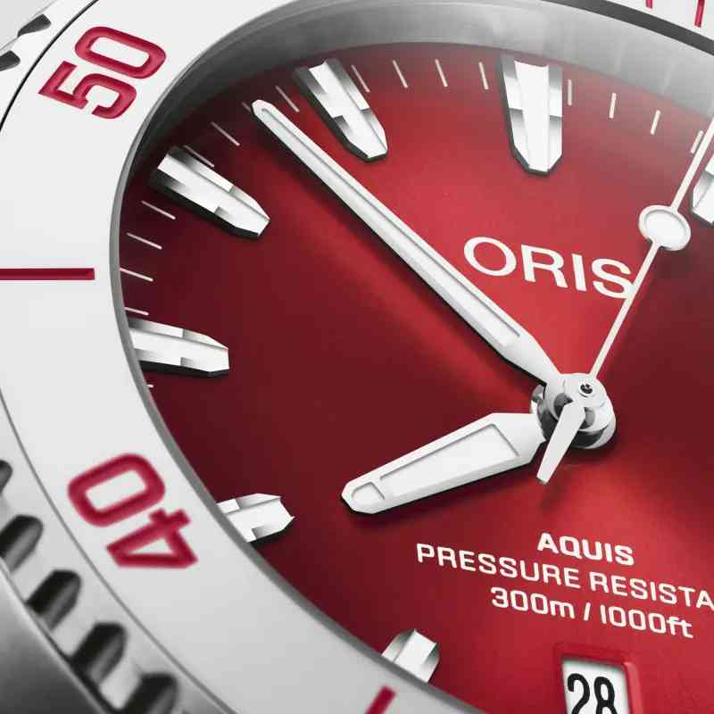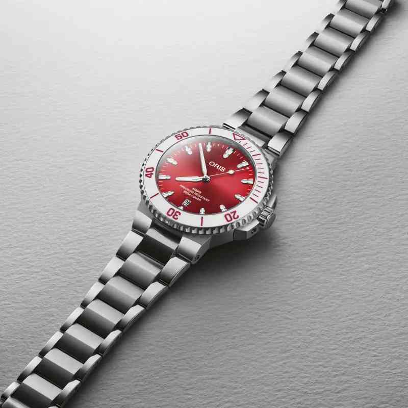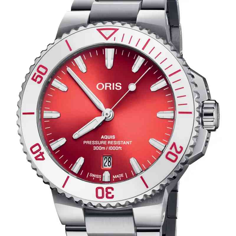 Oris est une marque suisse avec plus d’un siècle d’histoire. Fondée en 1904 à Hölstein par Paul Cattin et Georges Christian, elle tire son nom d’un ruisseau et d’un vallon situés dans les environs d’Hölstein, là où tout a commencé. Elle confectionne des garde-temps performants et robustes qui sauront surmonter toutes les situations. Robustes et fiables, ces derniers sont réalisés à partir de matériaux solides et de mécanismes précis en toute condition. La marque vous propose la montre Aquis Date Taste of Summer 01 733 7787 4138-07 8 22 04PEB. Vous noterez que cette ligne Aquis présente des designs modernes avec des innovations techniques donnant vie à des modèles fonctionnels au quotidien. Adaptés pour la vie urbaine comme dans l’obscurité des fonds marins, les garde-temps de cette collection sont utiles, charmants et polyvalents. Cette montre destinée à la gent masculine est munie d’un boîtier rond affichant 41,50 mm de diamètre et qui est réalisée en acier inoxydable brossé et poli. Ce dernier est muni d’une couronne grise, vissée et crantée assurant une bonne prise en main. De plus, elle est protégée et manipule les éléments centraux situés sous le verre saphir. Celui-ci est bombé sur les deux côtés et protège ces derniers contre les chocs potentiels. Il est pourvu d’un traitement antireflet qui assure une lisibilité sans contrainte. Vous remarquerez qu’il est entouré par une lunette unidirectionnelle, crantée et argentée avec un insert blanc comportant un marqueur luminescent suivi d’un chemin de fer des minutes. Le tout se ferme par un fond de boîte vissé qui assure une étanchéité de 30 ATM. Ce dernier est muni d’un verre minéral offrant une jolie vue sur les oscillations du mouvement.