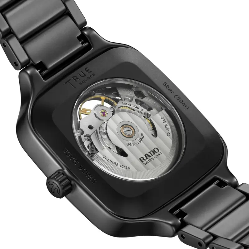 L’étanchéité de la Rado True Square Automatic Skeleton est un attribut essentiel, bien que discret. Avec une résistance à l’eau jusqu’à 5 atmosphères, ce garde-temps est conçu pour résister aux éclaboussures du quotidien et à l’immersion accidentelle. Cette étanchéité assure que le mécanisme complexe reste protégé, même en conditions humides. Bien qu’il ne soit pas destiné à la plongée profonde, il offre néanmoins une tranquillité d’esprit pour une utilisation ordinaire en toute sérénité.