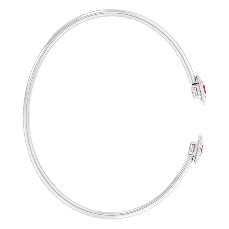 Ce bracelet à la particularité d’être flexible, il peut ainsi se régler sur votre poignet quel que soit votre tour de poignet. Celui-ci a été réalisé entièrement en or blanc disponible en version 750/1000 (18K). Ses extrémités de forme ovale sont somptueusement ornées de plusieurs diamants révélant avec élégance l’éclat de l’or. De plus, entouré par les diamants, nous retrouvons deux rubis ovales sertis. La couleur du rubis peut prendre plusieurs teintes allant du rouge intense, au rose et au violet. Le poids total des pierres et diamants est de 0,25 carat.